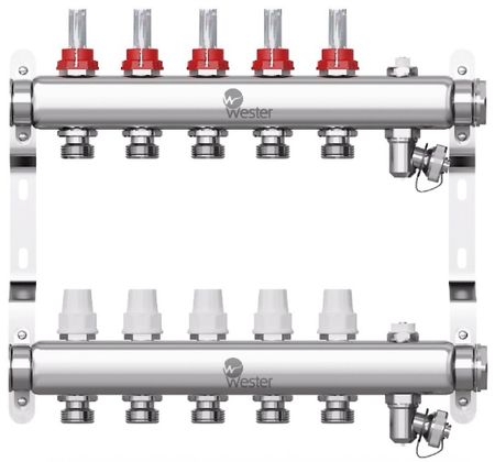 Коллектор из нержавеющей стали Wester (Вестер) 1″-3/4 в сборе с расходомерами на 5 выходов равномерно распределяет нагретую котлом воду между всеми отопительными контурами. Оптимальный вариант для организации системы водяного отопления в частных или многоквартирных домах. Устройство выполнено из нержавейки и не подвержено образованию коррозии.