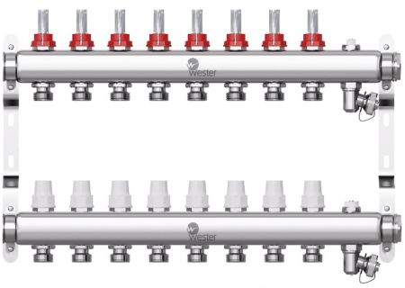 Коллекторы для систем отопления от компании Wester из модельного ряда W902 это устройства, которые стандартно оснащаются расходомерами и по своим эксплуатационным характеристикам отличаются высокой степенью надёжности и безопасности. В линейку вошли устройства, к которым можно подключить от 2 до 12 контуров.