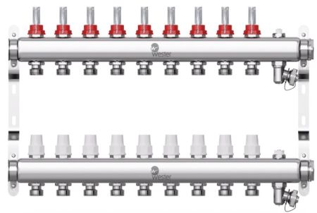 Коллектор из нержавеющей стали Wester (Вестер) 1″-3/4 в сборе с расходомерами на 9 выходов делает работу системы отопления водяного типа производительнее и эффективнее за счёт равномерного распределения потока теплоносителя по всем контурам. Модель отличается повышенным запасом прочности и способна выдерживать высокие температуры и давление.