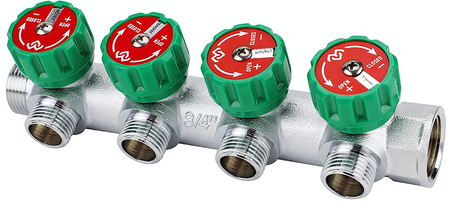 Распределительные коллекторы поставляются с размером основной магистрали 3/4″ или 1″ и могут иметь два, три или четыре выхода с наружной резьбой 1/2″ или 3/4″.