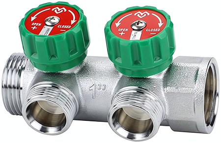 Распределительные коллекторы поставляются с размером основной магистрали 3/4″ или 1″ и могут иметь два, три или четыре выхода с наружной резьбой 1/2″ или 3/4″.
