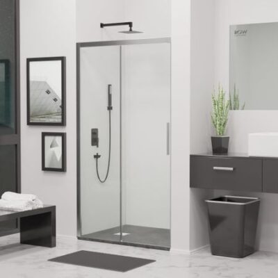 Душевая дверь с закаленным прозрачным стеклом 6 мм, с роликовым механизмом оснащенные автодоводчиком. Поддон приобретается отдельно.