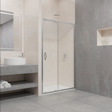 Душевая дверь состоит из 2-х секций, одно неподвижное стекло и раздвижная дверь от стены. Трап или поддон приобретается отдельно.