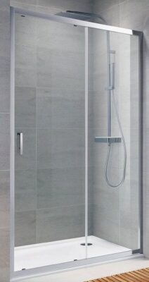 Душевая двухсекционная дверь. Размер двери 1200×1900 мм, имеет хромированный профиль, матовое стекло толщиной 6 мм.