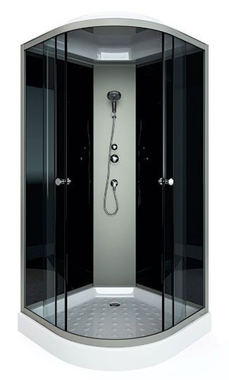 Душевая кабина Arcus style S-12G, 90 х 90 х 215 см, фронтальные стекла — серые тонированные, задние — черные Основные характеристики: поддон белый акриловый низкий 15 см фронтальные стекла: серые тонированные задние стекла : черные задняя панель серебро пластик хромированный алюминиевый профиль регулируемые ролики хромированные ручки для дверей 2-х режимный смеситель ручная лейка слив с сифоном крыша с верхней лейкой