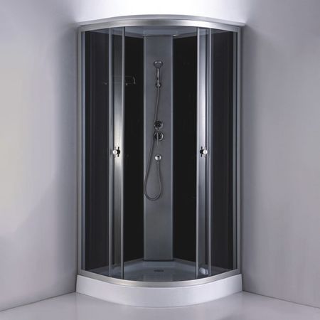 Профиль – хром.Переднее стекло – закаленное, с серым тонированием, толщиной 4 мм.Задние стенки стеклянные черные.Панель управления – хром матовый.Низкий поддон 14 см из ABS пластика белого цвета.Комплектация: верхний тропический душ, ручной душ, душевой шланг, держатель лейки, сифон, стеклянная полочка.