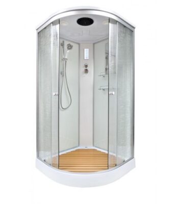 Кабина имеет усиленный акриловый поддон высотой 15 см с антискользящим покрытием. Плавность хода дверей обеспечена благодаря двойным саморегулирующимся металлическим роликам. Сифон имеет гидрозатвор. Характеристики: деревянная влагостойкая вставка в поддон (обработана при t 250°C); сенсорный пульт управления (управление: радио, освещение, принудительная вентиляция); принудительная вентиляция; сборка без силикона; резьбовые соединения всех шлангов; усиленный акриловый поддон; антискользящее покрытие поддона; двойные металлические ролики (верхние и нижние) в пластиковом антикоррозийном кожухе; штанга для ручного душа; парогенератор — дополнительная опция (приобретается отдельно). В парогенератор входит хромотерапия (лампочка меняет цвета), озонация воздуха (очистка воздуха в кабине от микробов, запах после грозы).