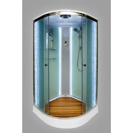 Кабина имеет усиленный акриловый поддон высотой 15 см с антискользящим покрытием. Плавность хода дверей обеспечена благодаря двойным саморегулирующимся металлическим роликам. Сифон имеет гидрозатвор. Характеристики: деревянная влагостойкая вставка в поддон (обработана при t 250°C); вертикальная LED-подсветка; вертикальный гидромассаж — 3 форсунки; вентиляционные отверстия в крыше; сборка без силикона; резьбовые соединения всех шлангов; усиленный акриловый поддон; антискользящее покрытие поддона; двойные металлические ролики (верхние и нижние) в пластиковом антикоррозийном кожухе; штанга для ручного душа.