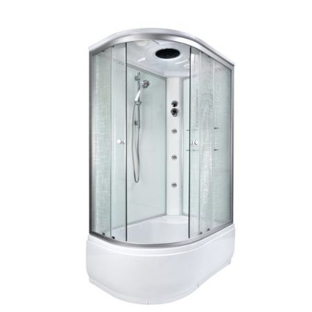 Кабина имеет усиленный акриловый поддон высотой 45 см с антискользящим покрытием. Плавность хода дверей обеспечена благодаря двойным саморегулирующимся металлическим роликам. Сифон имеет гидрозатвор. Характеристики: литое сиденье; вертикальный гидромассаж — 3 форсунки; вентиляционные отверстия в крыше; передний съемный экран поддона; сборка без силикона; резьбовые соединения всех шлангов; усиленный акриловый поддон; антискользящее покрытие поддона; двойные металлические ролики (верхние и нижние) в пластиковом антикоррозийном кожухе; штанга для ручного душа.