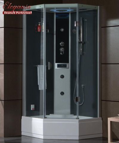 Паровая кабина с распашной дверью, высокий поддон акриловый с усиленным каркасом и сифоном, с алюминиевым плинтусом, задняя стеклянная панель. Функция: пар, сенсорный пульт, радио FM, вентилятор, верхний свет, душевая лейка на стойке, ручной душ, две форсунки, держатель полотенца, стеклянная полка, ручки латунь-хром, ролики двойные металлические. Размер — 950*950*2160 Толщина стекла — 6mm Цвет алюм. Профиля — серебро Цвет дверного стекла — прозрачный Цвет задних стекол — белый