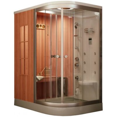 Если Вы хотите организовать настоящую сауну в своем доме, лучший вариант — это душевая кабина, совмещённая с финской сауной от производителя Frank. Она объединяет как обычную душевую кабину, так и сауну. В общем боксе находятся сразу два отделения: одно с душем, другое — с финской сауной. Между отделениями есть дверь, через которую можно пройти, непосредственно, во время процедур.