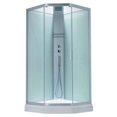 Пятиугольная душевая кабина 700 x 900 мм. 900 x 700 мм. смеситель с термостатом ручной душ потолочный душ набор для слива Стекло Прозрачное Тонированное Матовое Профиль Матовое серебро Поддон Белый прессованный мрамор белая передняя панель из алюминия. Высота: 2145 — 2165 мм верхний край потолочный душ. 2010 — 2030 мм верхний край кабина.