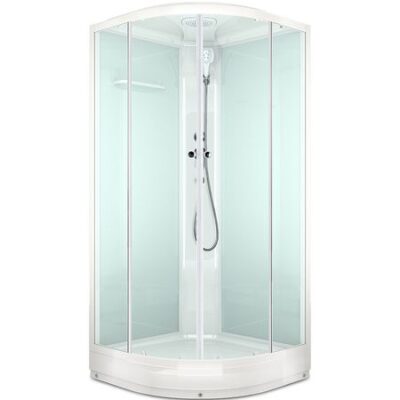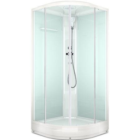 Угловая душевая кабина со стеклянными прозрачными дверцами, белыми стенками и профилем. Открытие и закрытие двери одной рукой. В комплекте смеситель, верхний душ и ручной душ на гибком шланге. Полочка для ванных принадлежностей.