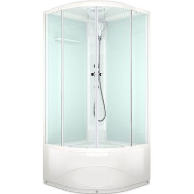 Угловая душевая кабина со стеклянными прозрачными дверцами и белыми стенками и профилем. Высокий поддон. Открытие и закрытие двери одной рукой. В комплекте смеситель, верхний душ и ручной душ на гибком шланге. Полочка для ванных принадлежностей.