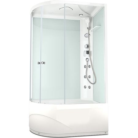 Ассиметричная душевая кабина со стеклянными прозрачными дверцами, белыми стенками и профилем. Высокий поддон. Открытие и закрытие двери одной рукой. В комплекте смеситель, верхний душ и ручной душ на гибком шланге. Полочка для ванных принадлежностей.