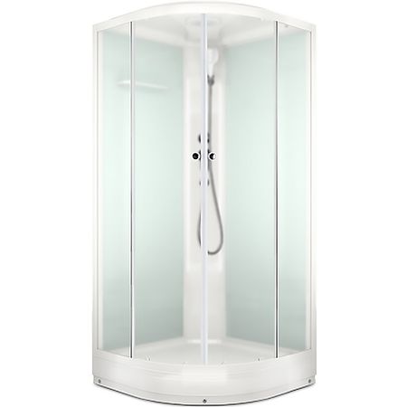 Угловая душевая кабина со стеклянными матовыми дверцами, белыми стенками и профилем. Открытие и закрытие двери одной рукой. В комплекте смеситель, верхний душ и ручной душ на гибком шланге. Полочка для ванных принадлежностей.