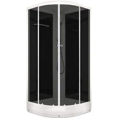 Угловая душевая кабина со стеклянными тонированными дверцами, черными стенками и белым профилем. Открытие и закрытие двери одной рукой. В комплекте смеситель, верхний душ и ручной душ на гибком шланге. Полочка для ванных принадлежностей.