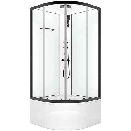 Угловая душевая кабина со стеклянными прозрачными дверцами, белыми стенками и черным профилем. Открытие и закрытие двери одной рукой. В комплекте смеситель, верхний душ и ручной душ на гибком шланге. Полочка для ванных принадлежностей.
