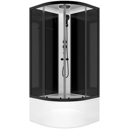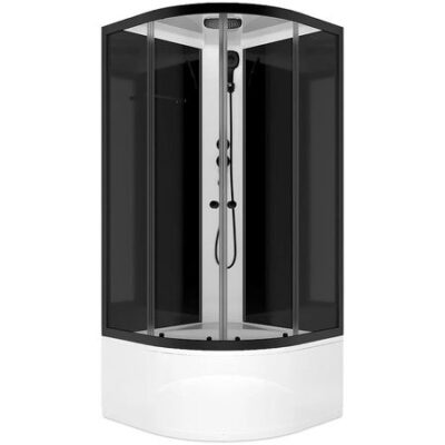 Угловая душевая кабина со стеклянными прозрачными дверцами, черными стенками и профилем. Открытие и закрытие двери одной рукой. В комплекте смеситель, верхний душ и ручной душ на гибком шланге. Полочка для ванных принадлежностей.