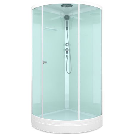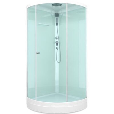 Угловая душевая кабина со стеклянными матовыми дверцами, белыми стенками и профилем. Открытие и закрытие двери одной рукой. В комплекте смеситель, верхний душ и ручной душ на гибком шланге. Полочка для ванных принадлежностей.