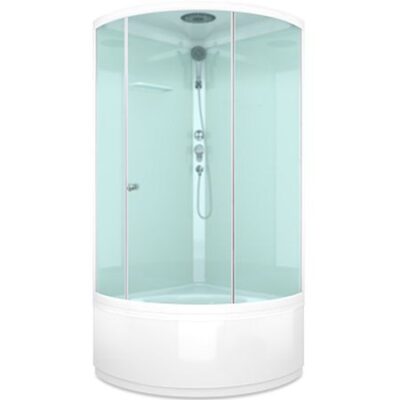 Угловая душевая кабина со стеклянными матовыми дверцами, белыми стенками и профилем. Открытие и закрытие двери одной рукой. В комплекте смеситель, верхний душ и ручной душ на гибком шланге. Полочка для ванных принадлежностей.
