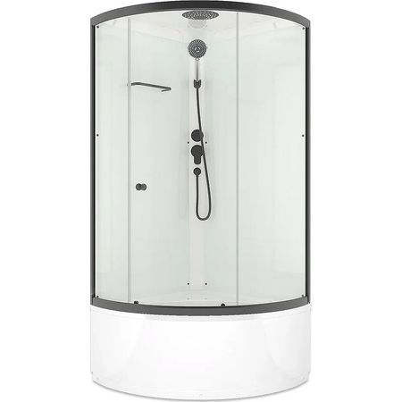 Угловая душевая кабина со стеклянными прозрачными дверцами, белыми стенками и графитовым профилем. Открытие и закрытие двери одной рукой. В комплекте смеситель, верхний душ и ручной душ на гибком шланге. Полочка для ванных принадлежностей.