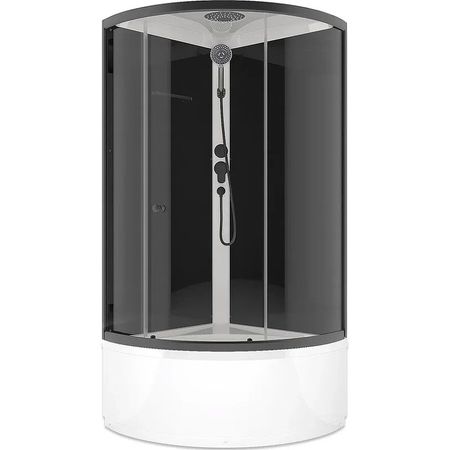 Угловая душевая кабина со стеклянными прозрачными дверцами, черными стенками и графитовым профилем. Открытие и закрытие двери одной рукой. В комплекте смеситель, верхний душ и ручной душ на гибком шланге. Полочка для ванных принадлежностей.
