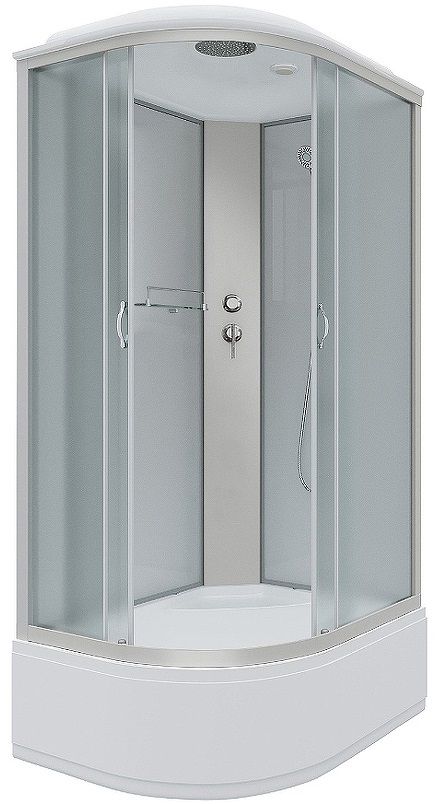 Стенки кабины, профиль, панель выполнены в матовом варианте. Внутри душевого бокса расположена пластиковая панель. На которой установлен смеситель и переключатель на дополнительную лейку.