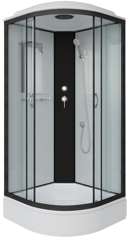 Профиль выполнен в черном варианте, стенки и двери кабины — белые матовые. Центральная панель пластиковая черного цвета, на ней установлен смеситель с переключателем режимов. Из аксессуаров, в кабине есть полка для средств гигиены, можно использовать дополнительные аксессуары на присосках.