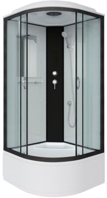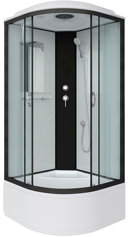 Профиль выполнен в черном варианте, стенки и двери кабины — белые матовые. Центральная панель пластиковая черного цвета, на ней установлен смеситель с переключателем режимов. Из аксессуаров, в кабине есть полка для средств гигиены, можно использовать дополнительные аксессуары на присосках.