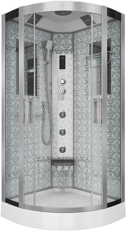 Задние стенки кабины выполнены из коленного стекла толщина которых 5 мм. Покрыты пленкой с рисунком (жемчужный занавес), в разных цветовых исполнений. Доступные цвета: Белый рисунок W, золотой рисунок G, черный рисунок B.