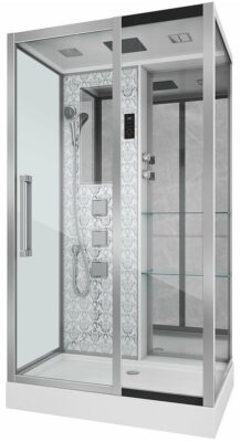 Широкий тропический душ с дополнительной подсветкой. Так же присутствует дополнительная 4-х режимная душевая лейка, которая крепиться на подвижную штангу держатель. Большое зеркало от пола до потолка кабины, встроенные 2-е полочки.