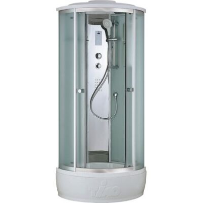 Душевая кабина Timo Comfort 80×80 T-8880C в форме четверти круга с прозрачным полотном двери.