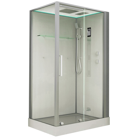 Общие характеристики Тип: закрытая кабина Ограждение: полностенное Форма: прямоугольная Высота поддона: 15 cм с усиленным каркасом и сифоном Варианты исполнения стенок: задние стенки супер-белого оттенка (6 мм) Конструкция дверей: раздвижные, толщиной 8 мм Количество створок двери: 2 Крыша: Стеклянная Функциональные возможности Массаж: гидромассаж спины Дополнительные функции: тропический душ из нержавеющей стали Мультимедиа и связь: Fm — радио Управление Электронное управление: есть (Сенсорный пульт управления) Дисплей: есть Особенности Комплектация: Тропический душ, Лейка, Однорычажный смеситель, Вентиляция, Стеклянная полочка, Ручки, Турецкая баня Освещение: верхняя подсветка, Хромотерапия — 7 цветов (с функцией Стоп-цвет) Габариты (ШхВхД): 120x220x90 см Дополнительная информация