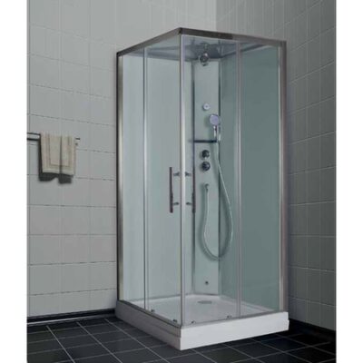 Акриловый поддон высотой 20 см со сьемным экраном. Диаметр сифона для поддона 90mm. Стеклянные задние стенки белоснежного оттенка. Раздвижные двери толщиной 6 мм. Двойные роллики. Анодированный, алюминиевый, хромированный профиль. Фирменый термостатический смеситель Timo. Верхний, боковой тропический душ. Душевая массажная лейка. Полочка и ручки из нержавеющей стали. БЫСТРАЯ ТЕХНОЛОГИЯ СБОРКИ — соединение профилей замочного типа.