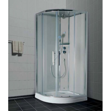 Акриловый поддон высотой 20 см со сьемным экраном. Диаметр сифона для поддона 90mm. Стеклянные задние стенки белоснежного оттенка. Раздвижные двери толщиной 6 мм. Двойные роллики. Анодированный, алюминиевый, хромированный профиль. Фирменый термостатический смеситель Timo. Верхний, боковой тропический душ. Душевая массажная лейка. Полочка и ручки из нержавеющей стали. БЫСТРАЯ ТЕХНОЛОГИЯ СБОРКИ — соединение профилей замочного типа