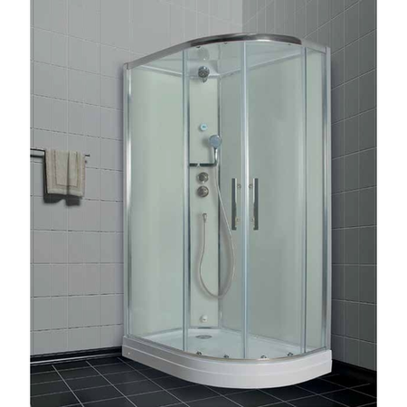 Акриловый поддон высотой 20 см со сьемным экраном. Диаметр сифона для поддона 90mm. Стеклянные задние стенки белоснежного оттенка. Раздвижные двери толщиной 6 мм. Двойные роллики. Анодированный, алюминиевый, хромированный профиль. Фирменый термостатический смеситель Timo. Верхний, боковой тропический душ. Душевая массажная лейка. Полочка и ручки из нержавеющей стали. БЫСТРАЯ ТЕХНОЛОГИЯ СБОРКИ — соединение профилей замочного типа.