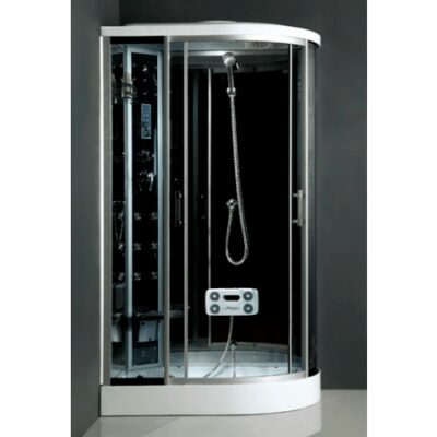 Описание и функции: Акриловый поддон (не ABS) h-15см , сливная система CLIK-CLAK с сифоном АНИПЛАСТ, откидывающееся сиденье. Алюминиевый профиль с T-жесткостью и специальной обработкой SILVER (неокрашенный) Закаленное (безопасное) стекло 5мм. Двойные металлические ролики. Сенсорный пульт нового поколения TsCP с функциями: FM-радио, верхняя и боковая подсветка, вентиляция. Встроенный однорычажный смеситель TIMO с четырехрежимным переключателем на верхний душ (TROPICAL RAIN), лейка с гибким шлангом, гидромассажем спины 6 джет и массажем ступней. Стеклянная полочка и диспенсер для геля и шампуня.