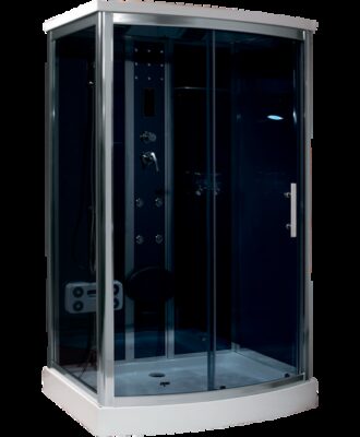 Акриловый поддон h — 15 см. с сифоном и усиленным каркасом. Анодированный алюминиевый профиль (матовый хром). Закаленное ударопрочное безопасное стекло толщиной 5 мм. Сенсорный пульт управления. Подсветка верхняя и боковая. FM-радио. Вентиляция. Смеситель однорычажный — четыре режима. Тропический душ. Лейка. Массажер ступней. Гидромассаж спины 6 джет. Двойные ролики. Стеклянная полочка. Откидное сиденье с допустимой нагрузкой не более 50 кг. Диспенсер. Ручки.