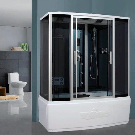 Акриловый поддон (не ABS) h-55см со сливной системой CLIK-CLAK по центру ванны, три съемных экрана. Алюминиевый профиль сT-жесткостью и специальной обработкой SILVER (неокрашенный). Закаленное (безопасное) стекло 5мм. Двойные металлические ролики. Сенсорный пульт нового поколения TsCP с функциями: FM-радио, верхняя и боковая подсветка, вентиляция. Встроенный однорычажный смеситель TIMO с четырехрежимным переключателем на верхний душ (TROPICAL RAIN), лейка с гибким шлангом, гидромассажем спины 6 джет и изливом для ванны. Стеклянная полочка и диспенсер для геля и шампуня. Откидывающееся сиденье и подголовник. Сборка кабины осуществляется изнутри