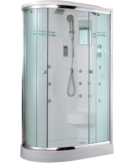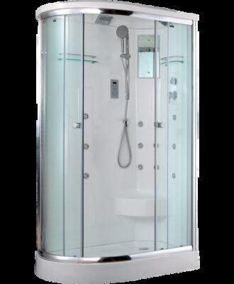 Душевая кабина Timo T-7702 R Размеры 1200х850х2200, прозрачные стекла, высота поддона 150 мм, верхний душ (тропический ливень), встроенный однорычажный смеситель TIMO с четырехрежимным переключателем на верхний душ (TROPICAL RAIN), анодированный, алюминиевый, хромированный профиль, сенсорный пульт нового поколения TsCP с функциями включения/выключения, FM-радио, зеркало, верхний свет, вентиляция, безопасное напряжение на выходе 12 V. Подарки всем покупателям душевых кабин Баннер Код для заказа:T-7702 R Технические характеристики Длина 120 Ширина 85 Высота 220 Ориентация Правосторонняя Форма Четверть круга Материал задних стенок Акрил Материал поддона Акрил Сиденье Одно стационарное Конструкция дверей Раздвижные Толщина стекла 6 Цвет стекл Прозрачное Цвет акрила Белый Количество створок двери 2 Профиль Алюминеевый Цвет профиля Хром глянцевый Цвет задних стенок Белый Тип поддона Низкий Высота поддона 15 Гидромассаж 12 форсунок Массаж спины 6 форсунок Парогенератор Опционально Мощность парогенератора 3 кВт Электро питание 12V Вентиляция Есть Ручной душ Многофункциональный Верхний душ Тропический ливень Смеситель Многофункциональный Дисплей Сенсорный Радио Есть Полочки 2 полочки Зеркало Есть Верхний свет Есть Сифон В комплекте Гибкая подводка В комплекте
