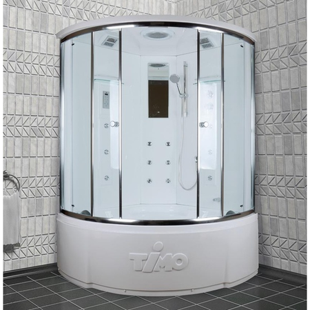 Душевая кабина с ванной Timo T-7725 Размеры 1200х1200х2200, прозрачные стекла, высота поддона 600 мм, верхний душ (тропический ливень), гидромассажная душевая система 6+6 джет, однорычажный регулятор температуры, встроенный однорычажный смеситель TIMO с четырехрежимным переключателем на верхний душ (TROPICAL RAIN), гидромассаж, лейку душа, набор воды в ванну. Стеклянная полочка, радио, верхний свет, сенсорный пульт нового поколения TsCP с функциями включения/выключения, FM-радио, верхняя подсветка (Лунный свет), вентиляция, безопасное напряжение на выходе 12 V. Подарки всем покупателям душевых кабин Баннер Код для заказа:T-7725 Технические характеристики Длина 1320 Ширина 120 Высота 220 Ориентация Нет Форма Четверть круга Материал задних стенок Акрил Материал поддона Акрил Полноценная ванна Без аквариума Сиденье Одно стационарное Конструкция дверей Раздвижные Толщина стекла 6 Цвет стекл Прозрачное Цвет акрила Белый Количество створок двери 2 Профиль Алюминеевый Цвет профиля Хром глянцевый Цвет задних стенок Белый Тип поддона Высокий Высота поддона 60 Гидромассаж 12 форсунок Массаж спины 6 форсунок Масажер ног Нет Парогенератор Опционально Мощность парогенератора 3 кВт Гидромассаж в ванне Опционально 6 Jet Аэромассаж в ванне Опционально 6-11 Jet Массаж спины в ванне Опционально 3 Jet Электро питание 12V Вентиляция Есть Ручной душ Есть Верхний душ Тропический ливень Смеситель Многофункциональный Дисплей Сенсорный Радио Есть Дозатор мыла Нет Полочки 2 полочка Верхний свет Есть Декоративная подсветка Нет Сифон C изливом для наполнения ванны Подголовники 1 Цвет подголовников Черный Гибкая подводка В комплекте