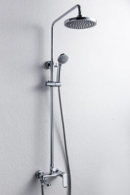 В комплекте: смеситель, душевая стойка, лейка, шланг, держатель