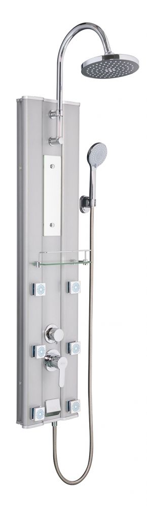 Душевая панель River 10 10000002344. Панель изготовлена из акрила и имеет полочку, верхний душ, зеркало, смеситель, трехпозиционный ручной душ, шесть гидромасссажных форсунок, каскадный излив.