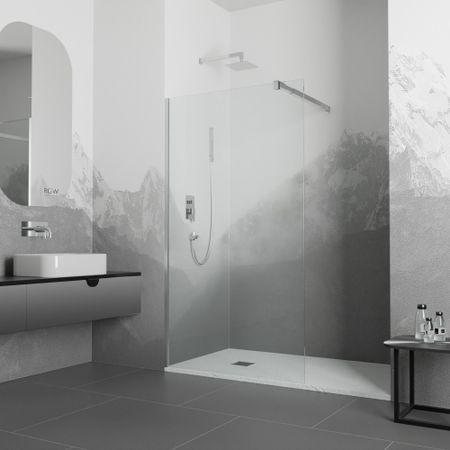 Душевая перегородка неподвижная. Длинна кронштейна 1200 мм. Трап или поддон приобретается отдельно. Занавеска для душа — дополнительная опция.