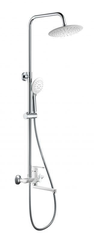 Состав комплекта: аэратор, полка, керамический картридж, рукоятка, душевой шланг 1.5 м, переключатель, 1-функциональная лейка, верхняя поворотная душевая лейка «Тропический дождь», регулируемое по высоте крепление для лейки