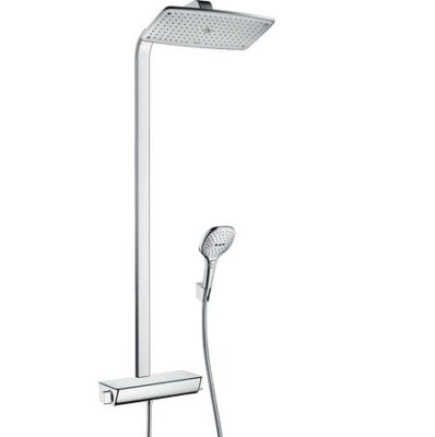 в набор входят: — верхний душ Raindance E AIR 1jet, 360 x 190 mm — держатель 380 мм — ручной душ Raindance Select 150 3jet (# 28587xxx) — держатель Porter’S (# 28331000) — шланг Isiflex 1,60 м (# 28276000) — термостат с предохранителем на 40ºC — запорный/переключающий вентиль на ручной и верхний душ — монтажные размеры 150 мм±12 мм — стеклянная полка, доступна в 2 цветах — прокладка для крепления на стену 8 мм — расход воды при 0,3MPa: верхний душ — 20 л/мин., ручной душ — 12 л/мин.