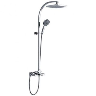 Комплектация: смеситель, душевая стойка, верхний душ, душевая лейка, душевой шланг, держатель для душевой лейки, настенный держатель, отражатели, эксцентрики
