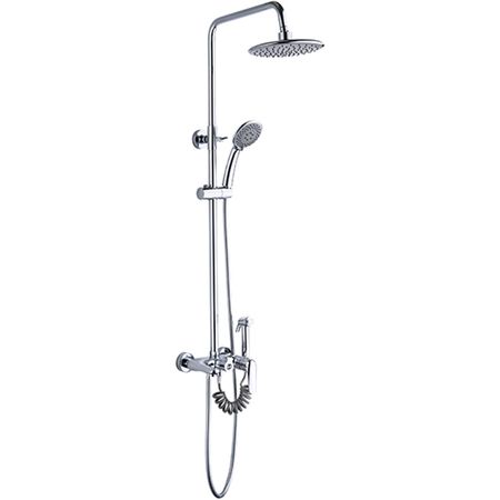 Комплектация: смеситель, душевая стойка, верхний душ, душевая лейка, душевой шланг, держатель для душевой лейки, настенный держатель, отражатели, эксцентрики, гигиенический душ