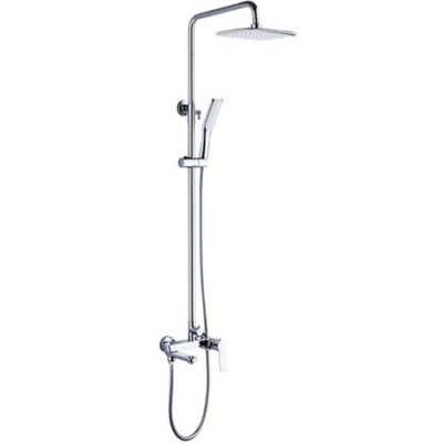 Комплектация: смеситель, душевая стойка, верхний душ, душевая лейка, душевой шланг, держатель для душевой лейки, настенный держатель, отражатели, эксцентрики
